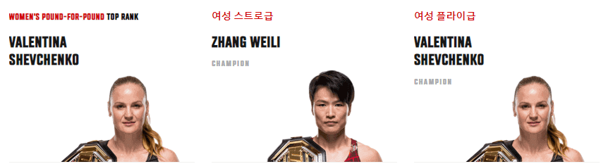 - 플라이급 (125파운드/56.7kg 이하) - 챔피언: 발렌티나 셰브첸코