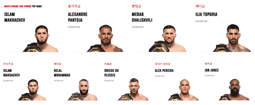 - 라이트헤비급 (205파운드/93kg 이하) - 챔피언: 알렉스 페레이라